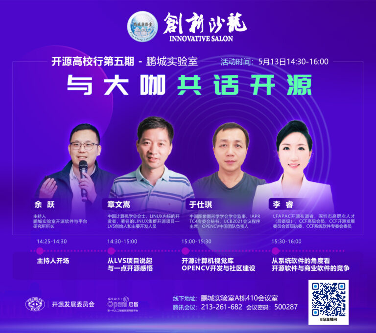 5月13日,鹏城实验室及其支持发展的OpenI启智社区联合CCF开源发展委员会,共同举办了以“与大咖共话开源”为主题的开源高校行系列活动,本次活动由鹏城实验室开源研究所所长余跃老师