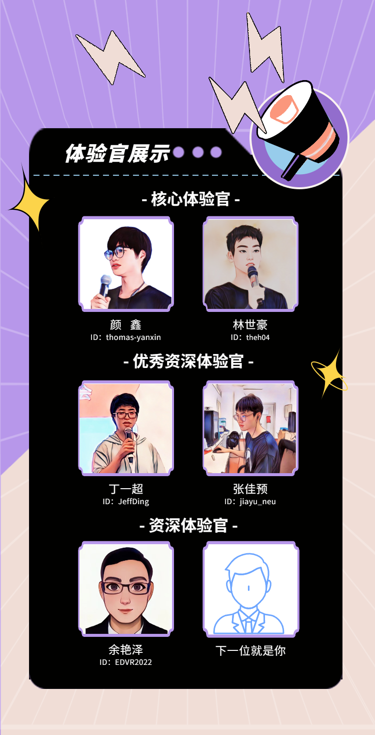 在任期内,我们将对大家的表现进行评审,通过后予以晋升或授予优秀称号。若资深体验官任期2年内未晋升或获得优秀称号,将自动离任。优秀资深体验官2次获优秀即可自动晋升为核心体验官。若核心体验官2年内未晋升或获得优秀称号,将降为资深体验官。王牌体验官亦然。已离任体验官仍将在官网展示,并标注已离任。