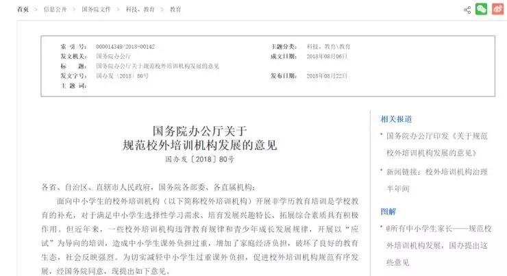 2018年8月,国务院发布的《关于规范校外培训机构发展的意见》中规定,要对校外培训机构进行审批登记、开展专项治理、强化日常监管,切实规范校外培训秩序。不得一次性收取时间跨度超过3个月的费用,加强对培训机构资金的监管。网信、文化、工业和信息化、广电部门在各自职责范围内配合教育部门做好线上教育监管工作。全面推行白名单制度,建立负面清单。