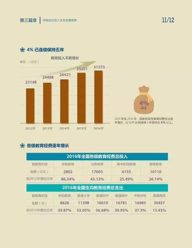 在行业监管政策趋严的同时,政府对教育行业的技术创新鼓励政策也在同步出台并在全国范围内推进实施。在经费投入方面,据教育部官网显示,2012至2016年,国家财政性教育经费支出连年增长,占GDP比例连续5年保持在4%以上,并且对教育信息化的经费投入力度也在持续加强。