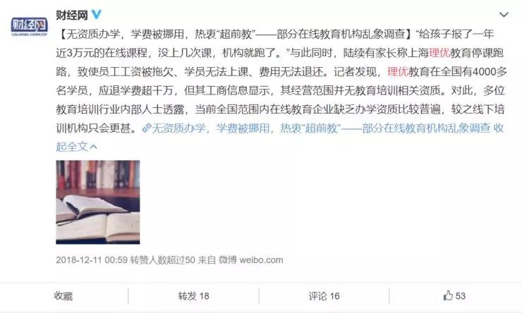 2018年,上海理优1对1、学霸1对1、芝麻街等教育公司跑路事件频出,已经造成了非常严重的负面影响,据界面新闻报道,2018年上海地区的教育培训相关投诉同比增多41.2%,已成为仅次于共享单车和旅行服务的消费者投诉“重灾区”。