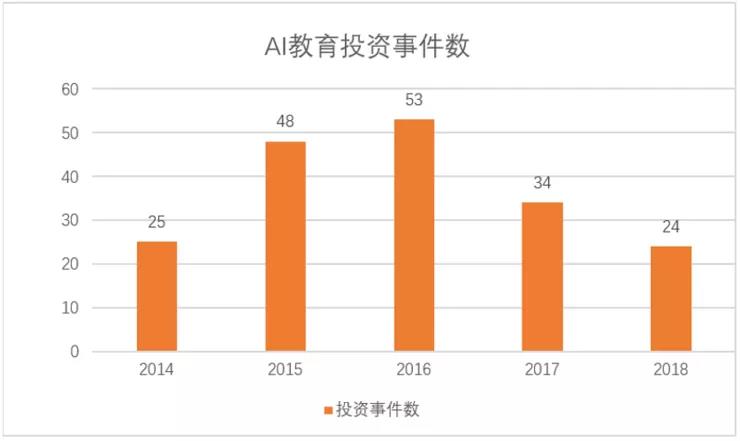 如下图所示,整个AI教育领域共220起投资事件,总投资额达336亿人民币。投资事件数量从2014年开始爆发,2016年达到高峰,2016年以后开始大幅回落,2018年只有24起AI教育投资事件。