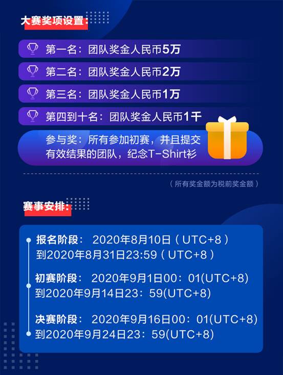 大赛向所有开发者开放,高等院校、科研单位、企事业单位及个人均可报名,参赛选手可单人成队亦可5人以下组团battle,叫上你的小伙伴,一起挑战吧!