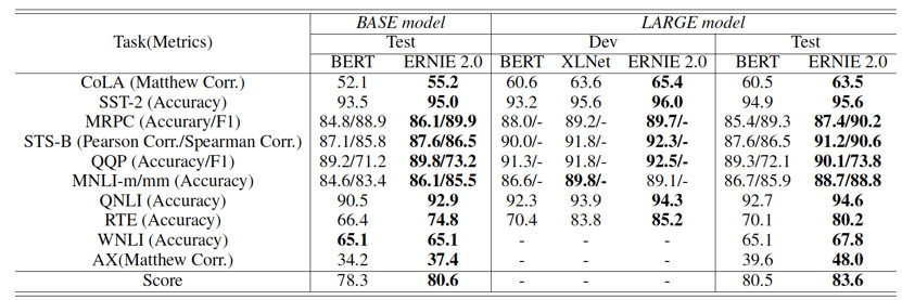 百度研究团队分别比较了中英文环境上的模型效果。英文上,ERNIE 2.0在自然语言理解数据集 GLUE 的7个任务上击败了 BERT 和 XLNet。中文上,在包括阅读理解、情感分析、问答等不同类型的9个数据集上超越了 BERT 并刷新了 SOTA。