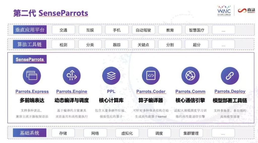 这就是现在商汤的整个的平台的技术架构。我们看到最底层是我们的基础系统,它提供包括存储、网络、虚拟化、调度等基础系统的能力。在这个系统基础之上,我们建立了我们新一代的 SenseParrots,它包含了从表达、编译与调度、计算、通信以及最终连接到模型部署的一系列的关键技术模块。