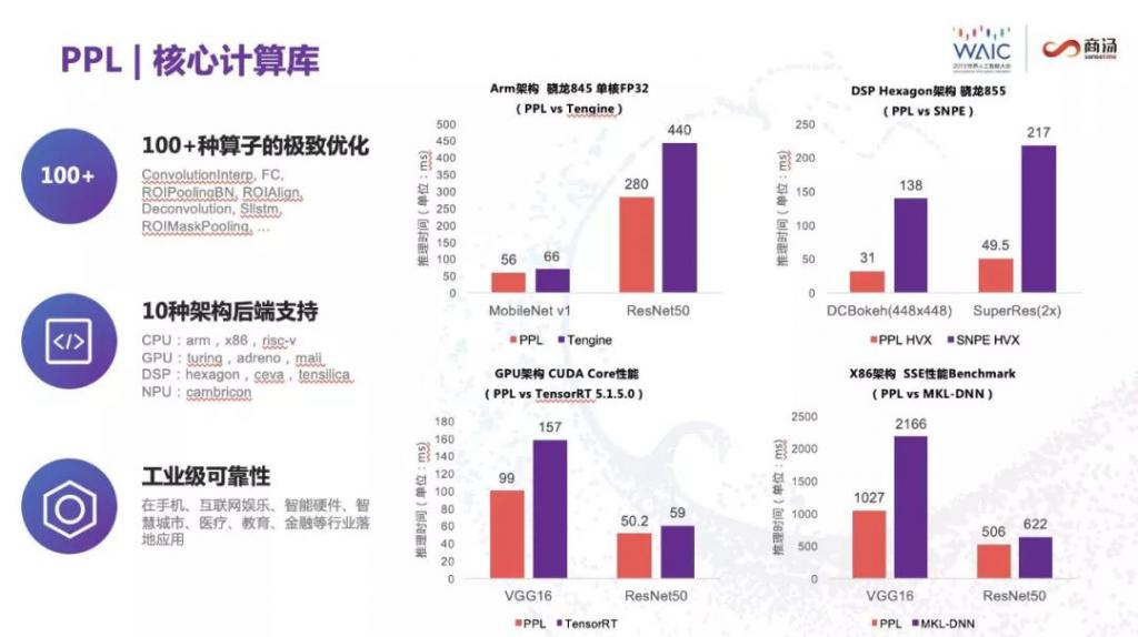 我们可以在这里看到,在多个不同的架构上面,对多个不同的算子我们取得了比原厂提供的算子服务显著的高性能。经过过去几年的迭代,我们的计算库达到了真正的工业级的可靠性,正在支持商汤全线产品的落地。