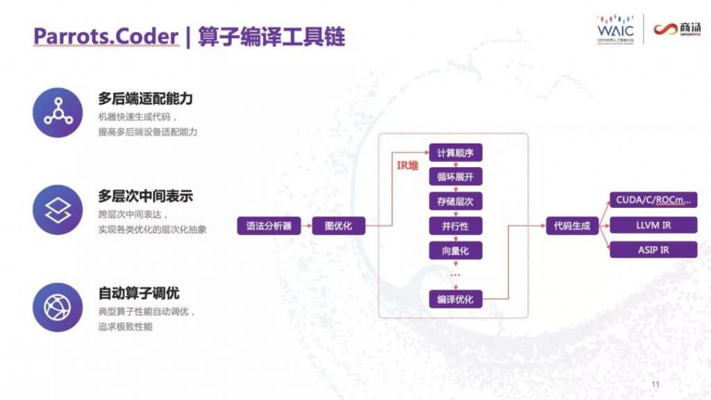 对每一个算子的具体执行,有一个我们自己研发的核心计算库 PPL(Parrots Primitive Library)。在这个计算库里面,我们对于超过一百个算子在十多种不同的架构上进行了极致的优化,它们支持了很多商汤业务里面非常重要的算子。