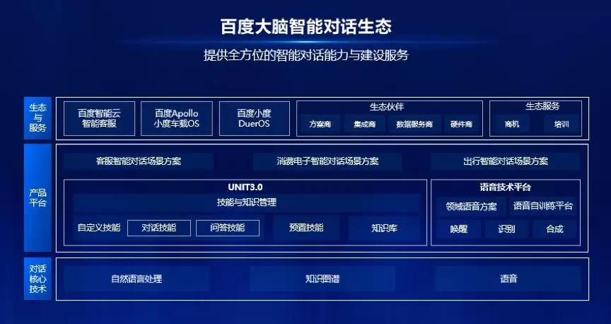 2017年7月,百度在 AI 开发者大会上发布对话系统定制平台 UNIT,它搭载了业界领先的对话理解与对话管理技术,可以帮助开发者赋予产品智能对话的交互能力;2018年7月,UNIT 推出的2.0版本,技术、功能与架构实现全面升级,为开发者提供更加易用、更加专业的对话系统定制能力。