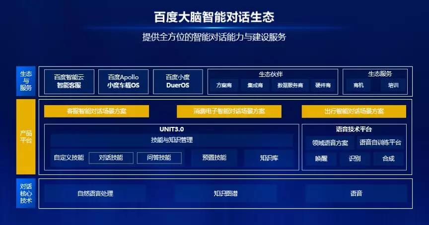 在智能对话领域,百度是走在前沿的创新者。基于百度多年积累的自然语言处理、知识图谱和语音等对话相关的 AI 技术,百度已形成包含 UNIT3.0 和语音技术平台的百度大脑智能对话引擎,并在此基础上推出客服、消费电子和出行三大智能对话场景方案。
