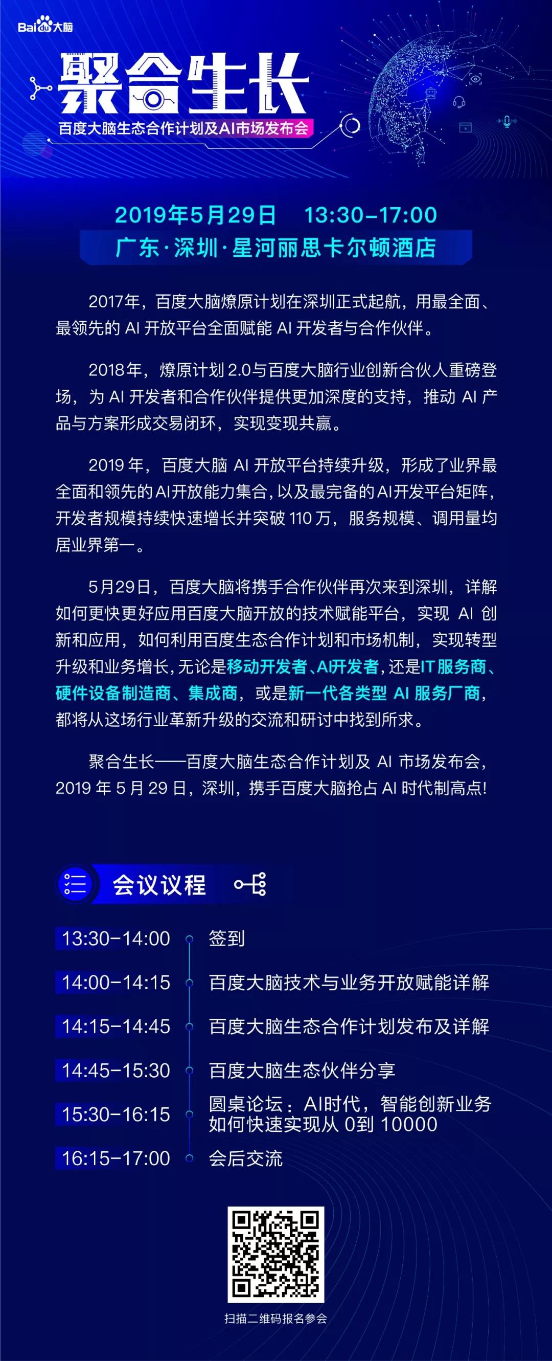5月29日(星期三),百度将在深圳召开百度大脑生态合作计划及 AI 市场发布会,向产业链上下游的 IT 集成商、服务商、硬件商、开发者、AI 服务商等合作伙伴展现百度大脑生态建设的实力与诚意。