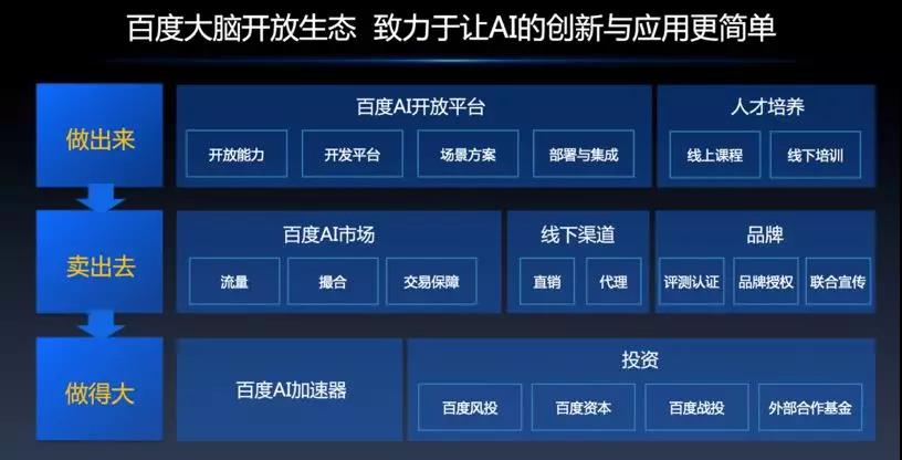 百度大脑发现,在产业智能化转型的过程中,企业进行业务创新和应用落地面临着三大挑战:研发难度高、市场与营销定位模糊、资金人力成本问题。为此,百度大脑发布了“做出来、卖出去、做得大”三步进阶的生态合作伙伴计划。